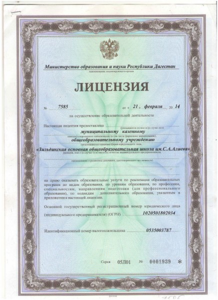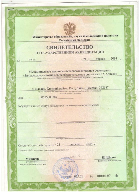 | Полное наименование образовательной организации* | Муниципальное казенное общеобразовательное учреждение "Зильдикская основная общеобразовательная школа им. С.А. Алиева" |